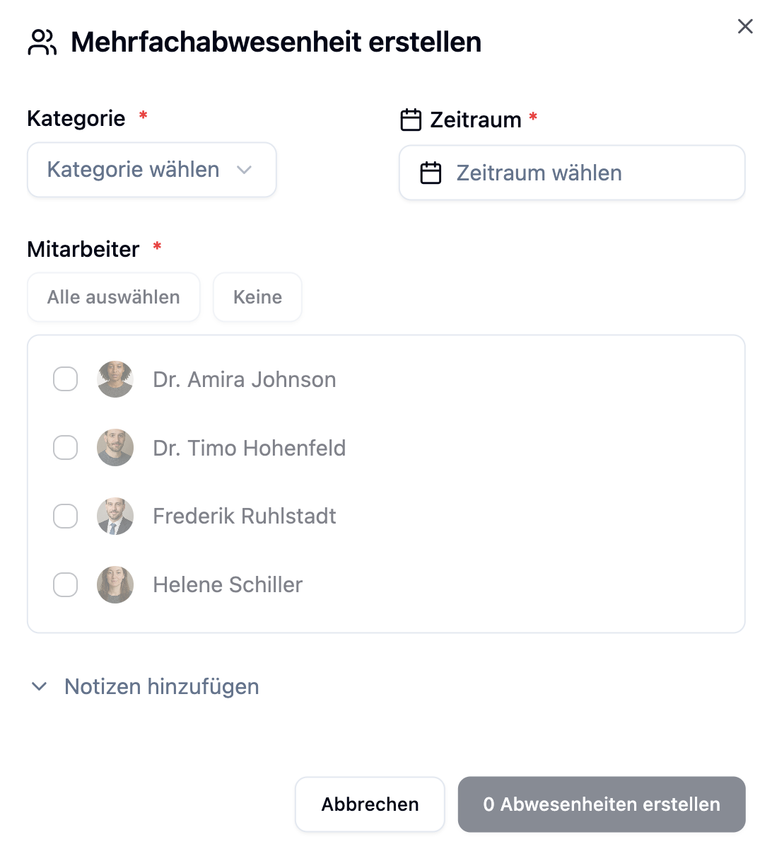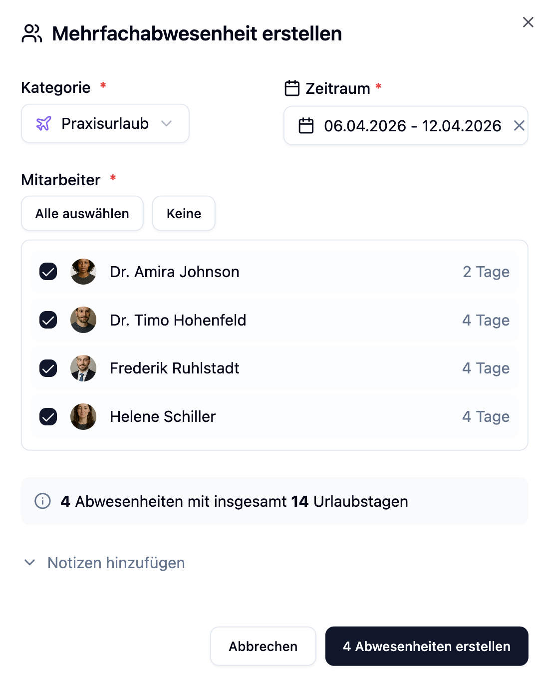 Mit Mehrfachabwesenheiten erstellst du Abwesenheiten für mehrere Mitarbeiter gleichzeitig. Das ist besonders praktisch für Praxisurlaub, Betriebsferien oder Team-Events, bei denen das gesamte Team oder eine Gruppe von Mitarbeitern gleichzeitig abwesend ist.
