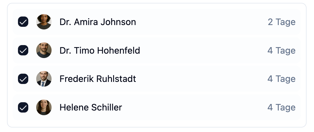 Nutze Mehrfachabwesenheiten für alle Situationen, in denen mehrere Mitarbeiter gleichzeitig abwesend sind. Das spart Zeit und stellt sicher, dass die Urlaubstage für jeden Mitarbeiter korrekt berechnet werden. Prüfe vor dem Erstellen, ob alle betroffenen Mitarbeiter feste Arbeitszeiten konfiguriert haben - so erhältst du präzisere Berechnungen.