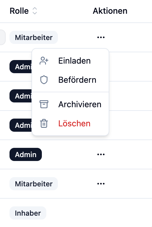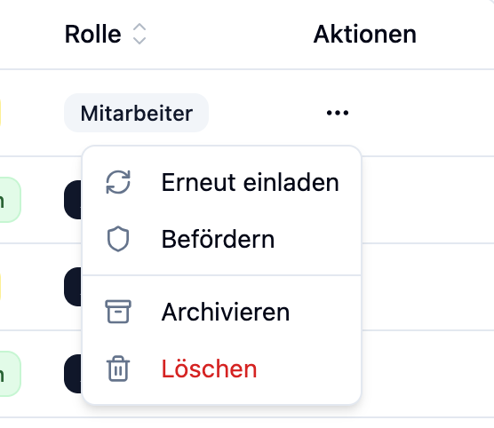 Das nachträgliche Einladen und das erneute Einladen funktionieren über das gleiche Drei-Punkte-Menü. Je nach aktuellem Status des Mitarbeiters wird die passende Option angezeigt.