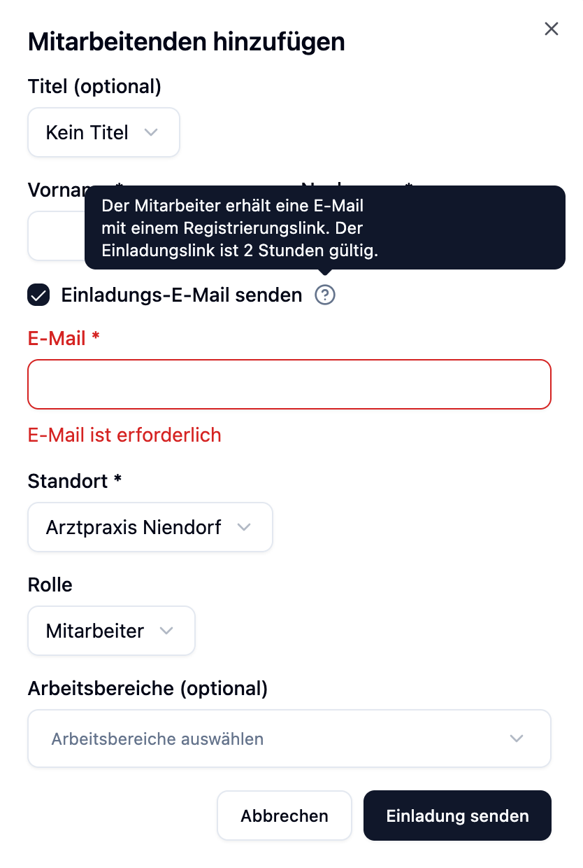 | Nicht eingeladen | Mitarbeiter wurde angelegt, aber noch keine Einladung gesendet |
