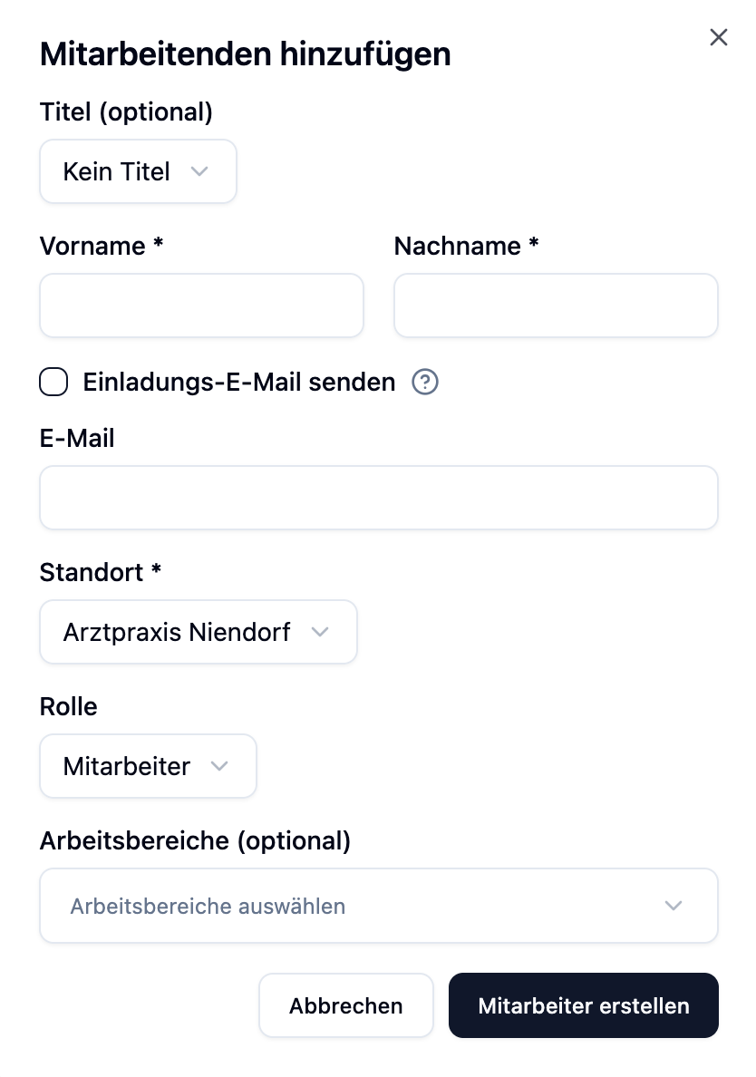 Nach dem Klick auf + Mitarbeiter hinzufügen öffnet sich ein Dialog mit allen Eingabefeldern.