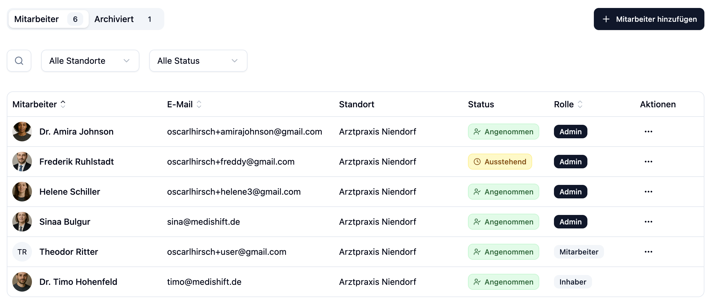 Bevor du Schichten planen kannst, musst du deine Mitarbeiter in medishift anlegen. Dabei kannst du entscheiden, ob du sie direkt per E-Mail einlädst oder erst später.