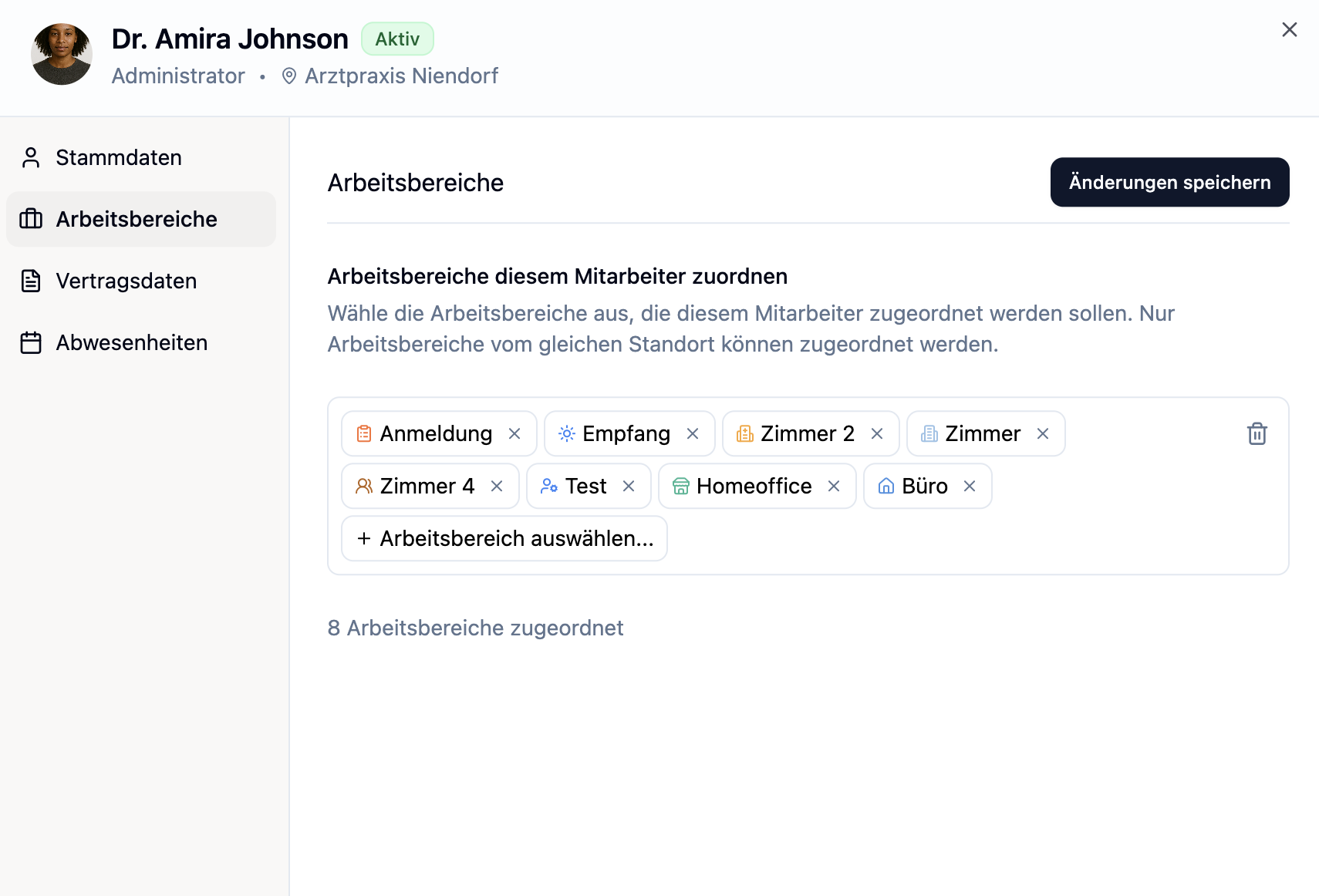 Im Tab Arbeitsbereiche legst du fest, in welchen Bereichen der Mitarbeiter eingesetzt werden kann.
