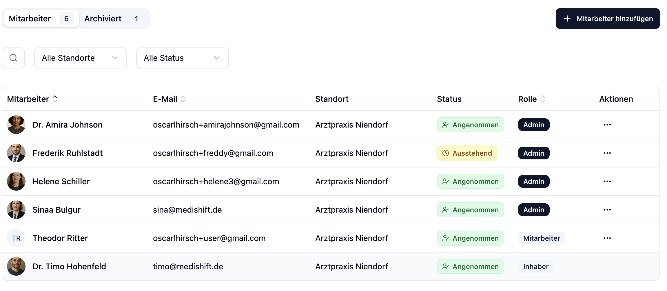 Wenn ein Mitarbeiter bereits eine Einladung erhalten hat (Status "Ausstehend"), kann die E-Mail-Adresse nicht mehr geändert werden. Du müsstest den Mitarbeiter archivieren und neu anlegen.