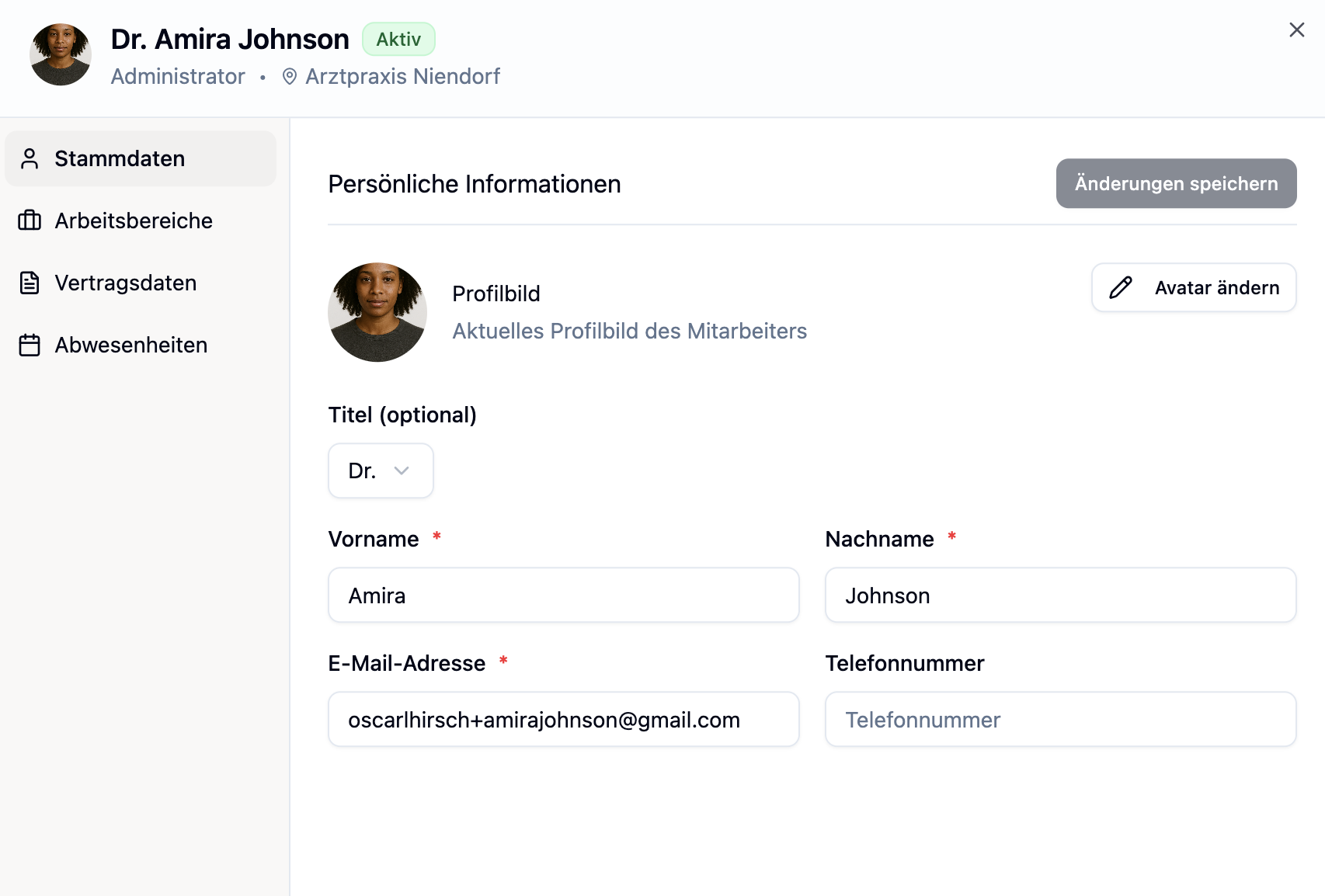 Nachdem du einen Mitarbeiter angelegt hast, kannst du sein Profil jederzeit bearbeiten. Das Mitarbeiterprofil ist in vier Bereiche unterteilt: Stammdaten, Arbeitsbereiche, Vertragsdaten und Urlaubskonto.