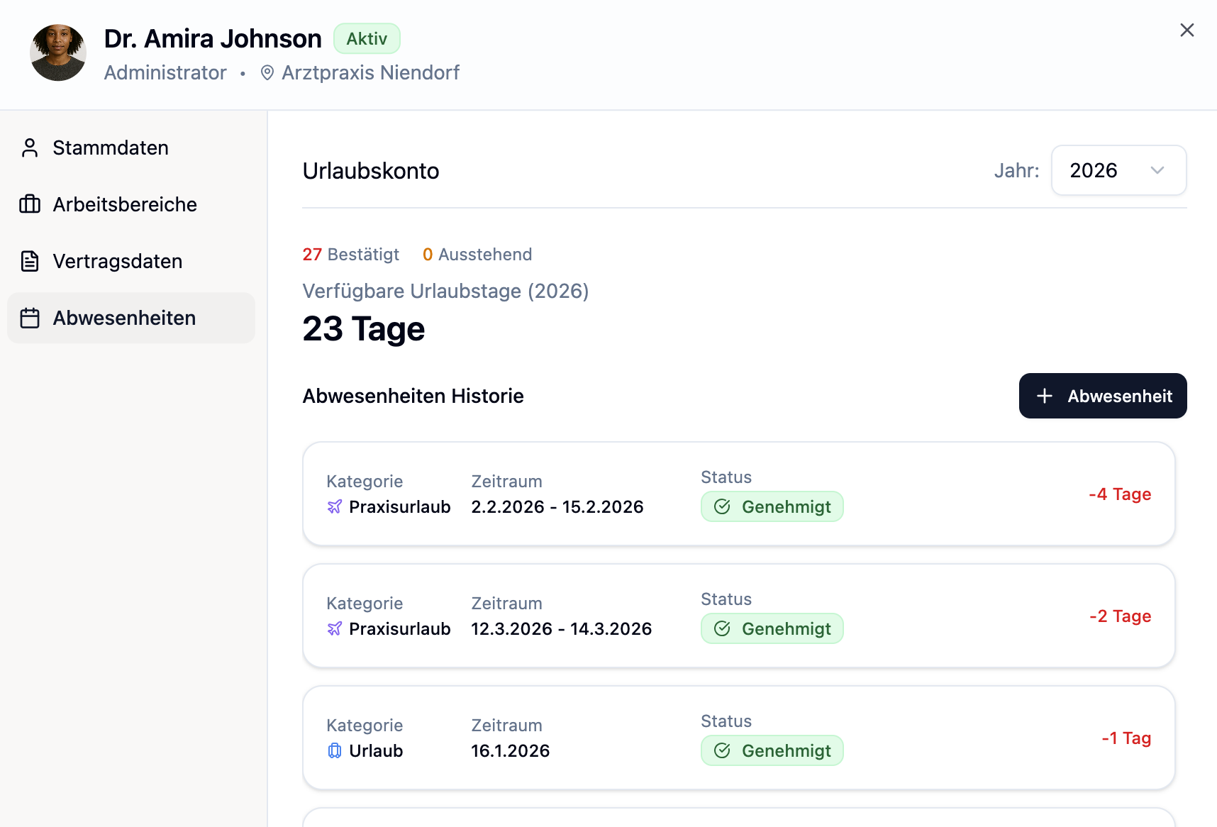 Unterhalb der Urlaubskonto-Übersicht siehst du alle Abwesenheiten des Mitarbeiters für das ausgewählte Jahr: