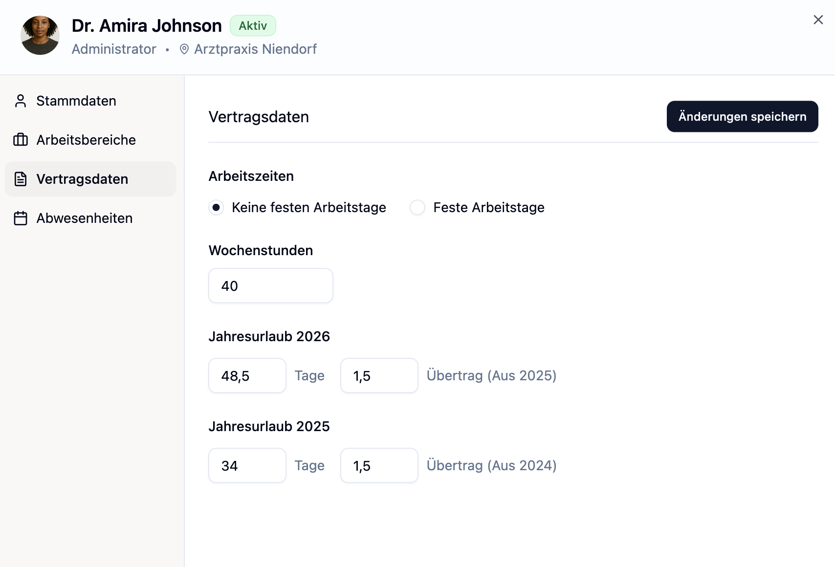 Wenn du die Jahresurlaubstage oder den Übertrag ändern möchtest, gehe zum Tab Vertragsdaten und passe die Werte im Abschnitt "Urlaubstage und Übertrag" an.
