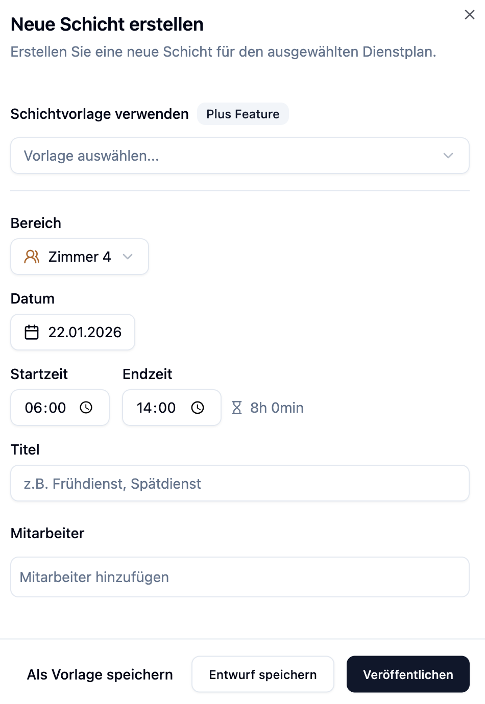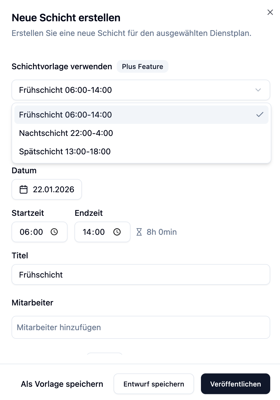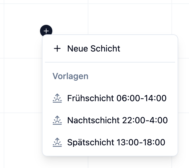 - Schichtvorlagen: Wenn du dieselbe Art von Schicht häufig an verschiedenen Tagen erstellst (z.B. "Frühdienst", "Spätdienst", "Nachtdienst")